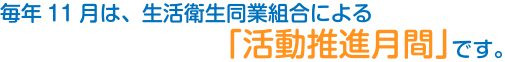 道内13の生活衛生同業組合では、本年11月の「生活衛生同業組合活動推進月間」において、北海道、札幌市をはじめ関係行政機関等のご支援ご協力のもと、生衛組合の活動や役割を周知広報するとともに、組合活動活性化のための取組みを実施します。